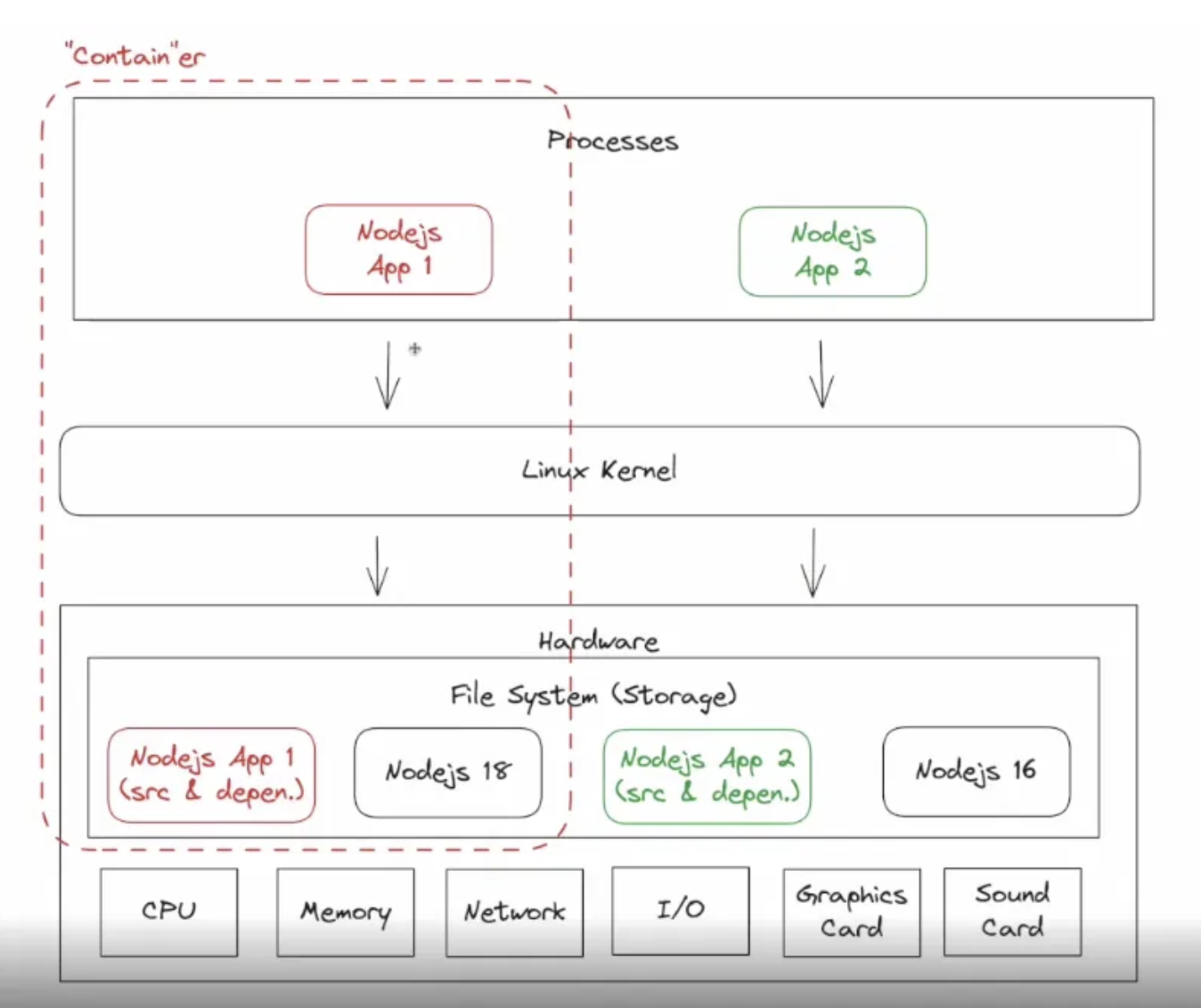 3. **하드웨어 자원 공유** : 모든 컨테이너는 같은 하드웨어 자원을 공유한다. 이는 실제 물리적 서버나 클라우드 기반의 가상 서버일 수 있으며, CPU, 메모리, 네트워크 인터페이스 등의 자원을 컨테이너 간에 분배한다.