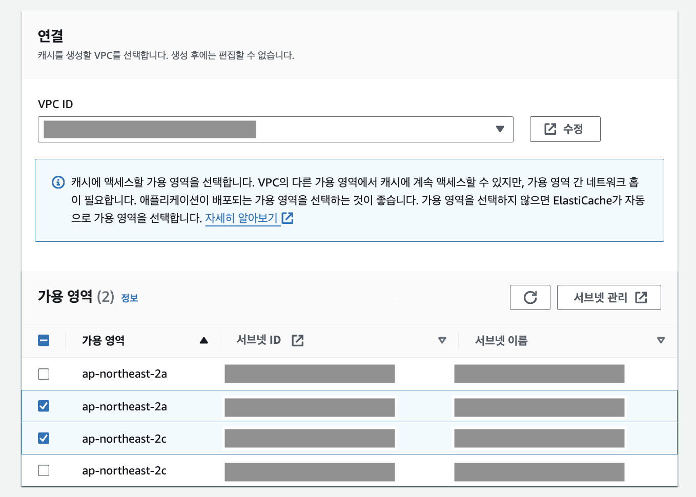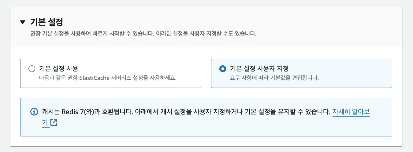 4. 3에서 기본 설정 사용자 지정으로 선택 시, VPC와 가용 영역을 지정할 수 있습니다. 일반적으로 Redis는 보안에 취약하기에 가능하면 Private Subnet에 위치시켜 Private Subnet에 위치한 WAS와만 통신시키는게 보안상 유리합니다. 저는 Redis 설정 전 생성해둔 VPC, Subnet을 선택했습니다. 연결 설정 시 가용 영역은 반드시 2개 이상의 가용 영역과 Subnet을 선택해야합니다. ALB 등을 설정할 때도 가용 영역을 반드시 2개 이상 선택하는데 이것과 유사한 개념이라고 생각하면 될 것 같습니다.