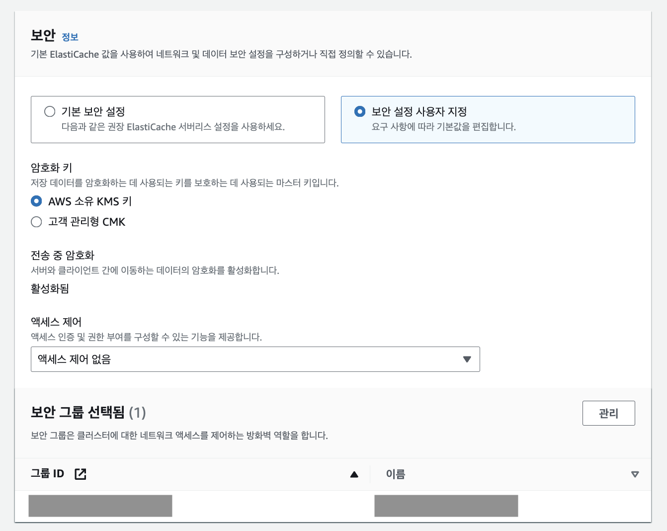 5. 보안 탭에서는 [보안 설정 사용자 지정]을 선택했고, 보안 그룹에서 Redis용으로 생성해둔 보안 그룹을 선택했습니다. 선택한 보안 그룹에는 Redis의 기본 포트인 6379 포트를 오픈했습니다.
