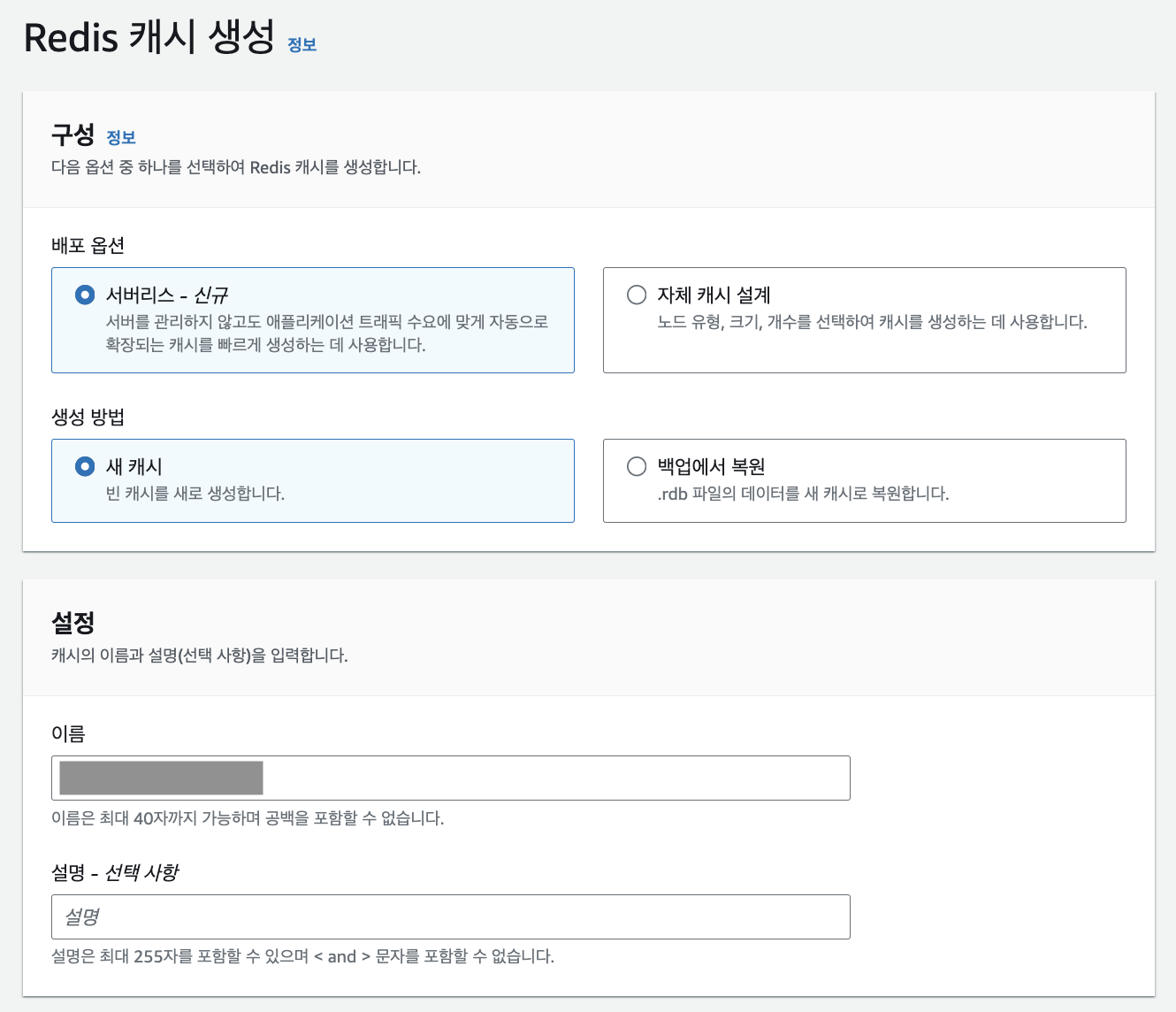 2. [서버리스 - 신규], [새 캐시]를 선택하고, [서버 이름]과 [설명]을 작성합니다.