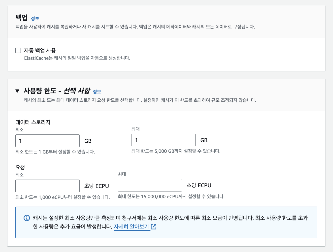 6. 별도 백업 설정은 하지 않았고, 사용량 한도에서 데이터 스토리지를 최소/최대 1GB로 설정했습니다. 1GB 기준 한달 약 100달러 정도로 사용 가능하며, 1GB 용량으로도 꽤 많은 데이터를 캐싱할 수 있습니다. 모니터링을 적절히 확인하며 용량을 관리해주시면 될거 같습니다.