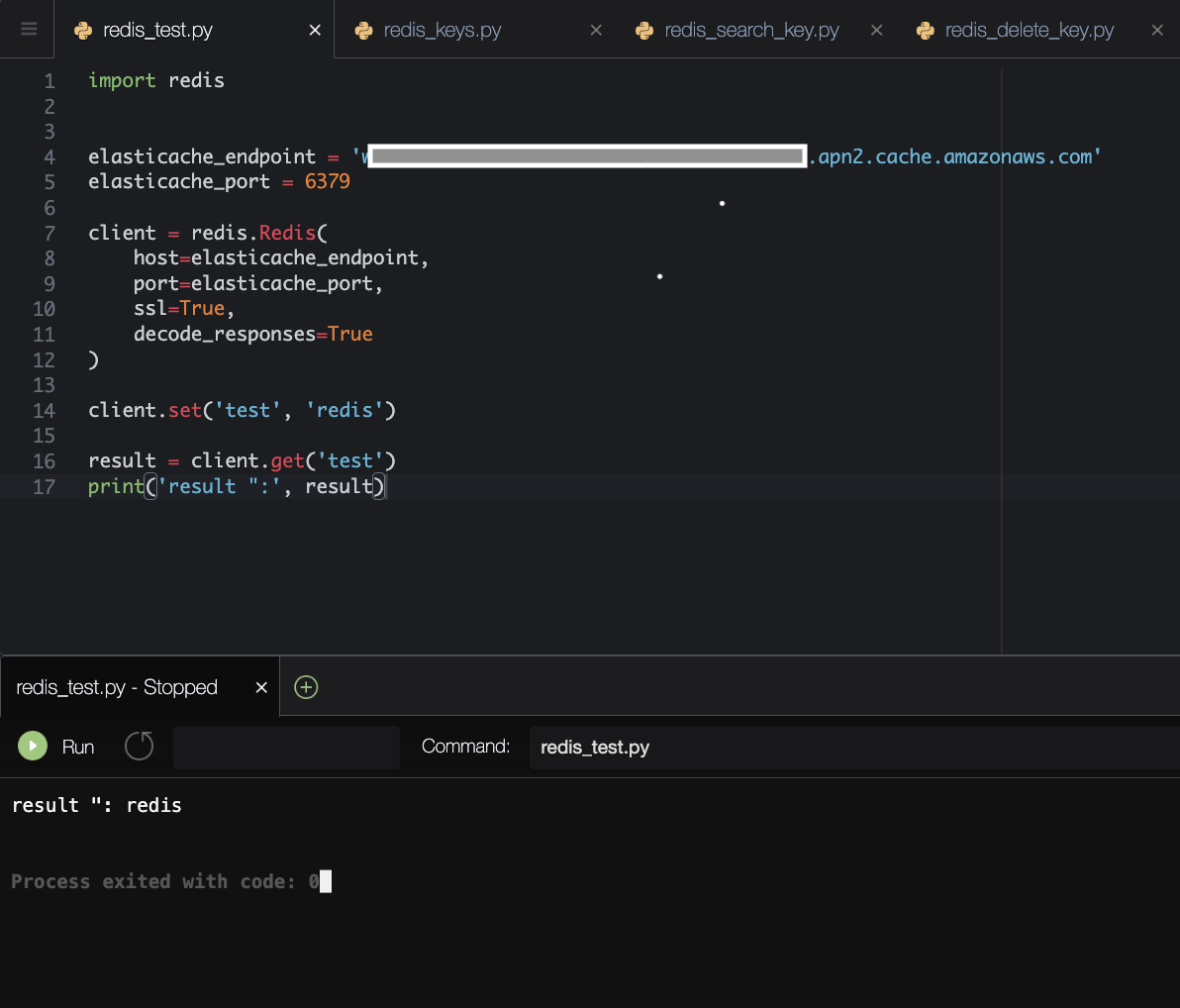 10. 간단한 동작 테스트를 위해 AWS Cloud9 서버를 Redis를 생성한 VPC, Subnet에 생성한 뒤 테스트 했습니다. 'test' key로 데이터를 캐싱한 뒤 호출해보는 간단한 Python 코드를 작성해보았습니다.